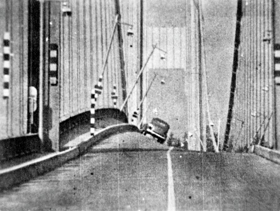 On that day, the winds increased to about 40 mph as a cross-wind coming across the bridge. The National Weather Service states that wind must ordinarily reach at least 45 mph before “slight damage” can occur. So clearly, the force of the wind alone was not the cause of the collapse. The bridge itself was experiencing a severe form of resonance, leading to its disastrous collapse as shown.